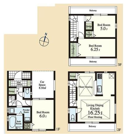 上記物件と同じく、中野区野方1丁目、JR中央線「中野駅」と西武新宿線「野方駅」の2路線が利用可能な新築分譲物件です。木造3階建てであるのは共通ですが、こちらは2階のLDKが16.25帖、1階はカーポートとバス、トイレ、洗面所に6帖の洋室。3階に洋室2部屋の間取りです。
